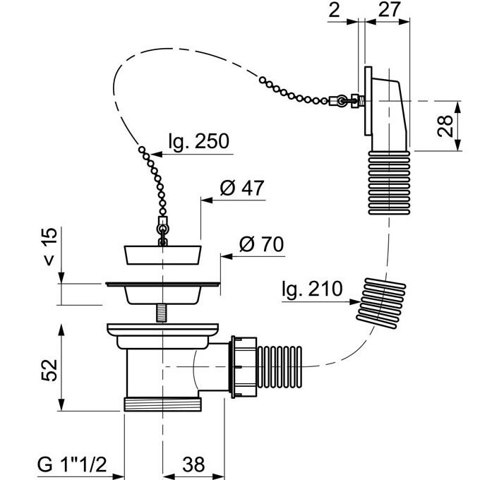 Bonde à bouchon pour évier 1 bac Ø50 mm (inox) avec trop-plein rectangulaire
