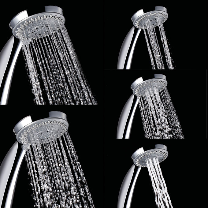 5 jets : changement par rotation. pluie fine, pluie dense, massage, pluie fine/pluie dense, pluie fine/massage.