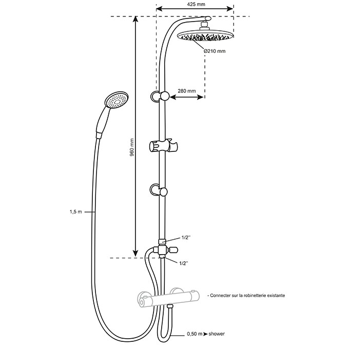 Colonne à connecter sur la robinetterie existante grâce à un flexible de 50 cm fourni.
