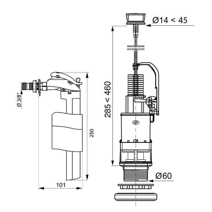 MP90, mécanisme de wc simple chasse à commande mécanique + robinet flotteur servo-valve latéral