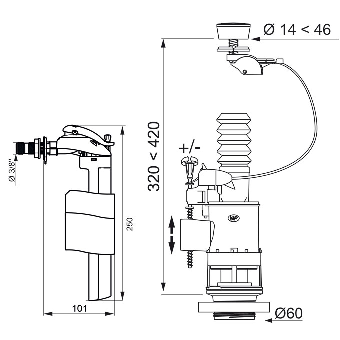 Hauteur de réservoir : de 320 à 420 mm.