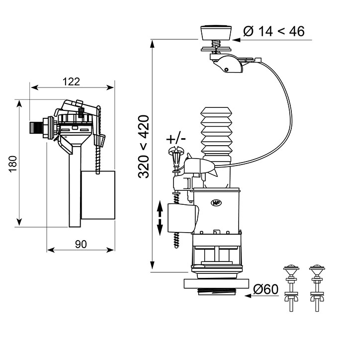 MW2+ TOPY, mécanisme de wc double chasse à commande à câble + robinet flotteur servo-valve compact