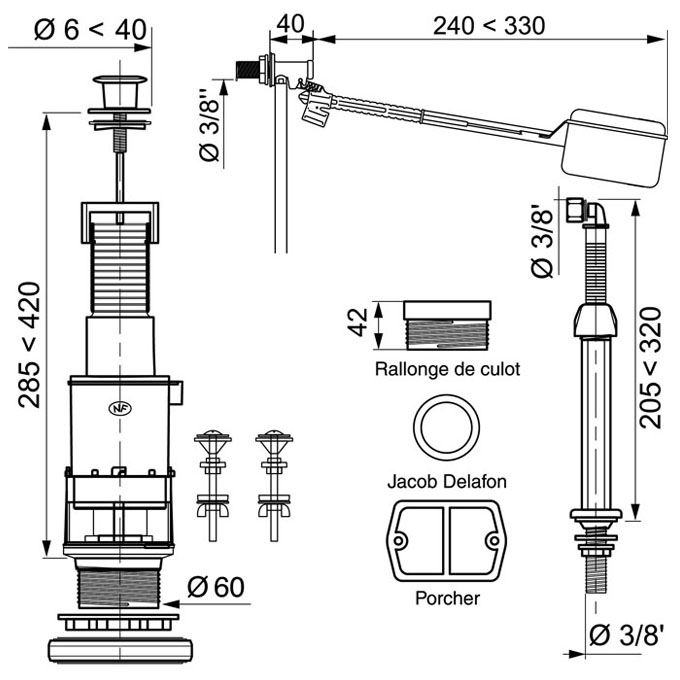 MXS111, mécanisme de wc à tirette + robinet flotteur à levier pour céramiques porcher et jacob delafon
